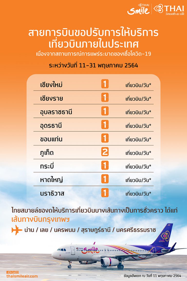 ไทยสมายล์ ประกาศปรับเที่ยวบินที่ให้บริการในเดือนพฤษภาคม