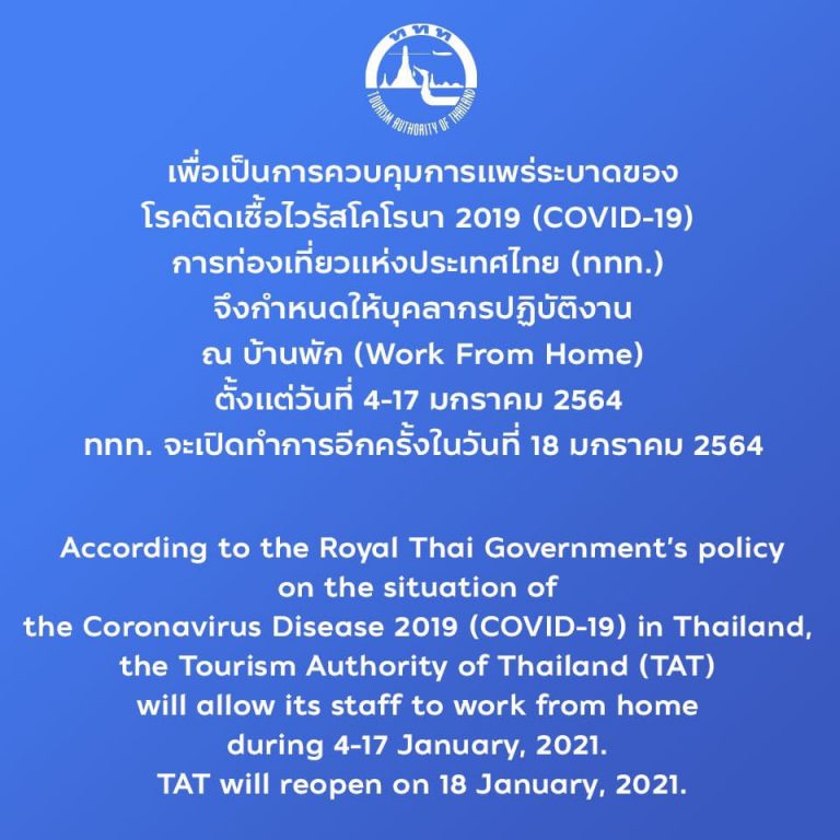 ททท.ประกาศให้บุคลากรปฎิบัติงาน ณ บ้านพัก (work from home)ถึง4-17 มค.64