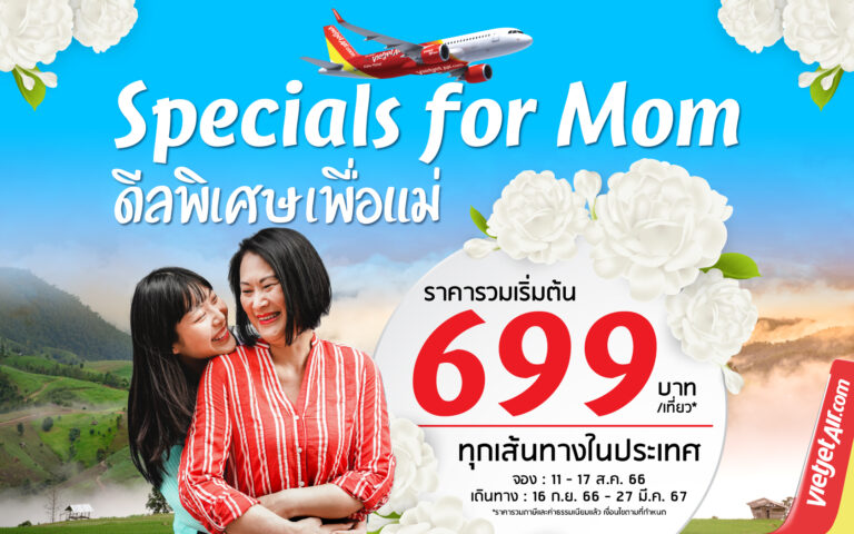 (กรุงเทพฯ,11สิงหาคม2566) –สายการบินไทยเวียตเจ็ทฉลองเทศกาลวันแม่ด้วยโปรโมชั่น “ดีลพิเศษเพื่อแม่ (Specials for Mom)” เสนอบัตรโดยสารราคาพิเศษ เริ่มต้นเพียง699บาท (ราคารวมภาษีและค่าธรรมเนียม) สำหรับเดินทางบนเครือข่ายเส้นทางบินภายในประเทศของไทยเวียตเจ็ท ผู้โดยสารสามารถสำรองบัตรโดยสารได้ระหว่างวันที่11–17สิงหาคม2566เดินทางได้ระหว่างวันที่16กันยายน2566–27มีนาคม2567(ยกเว้นวันหยุดนักขัตฤกษ์) ที่www.vietjet